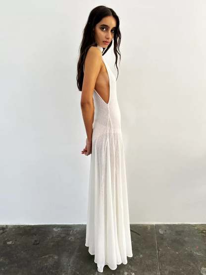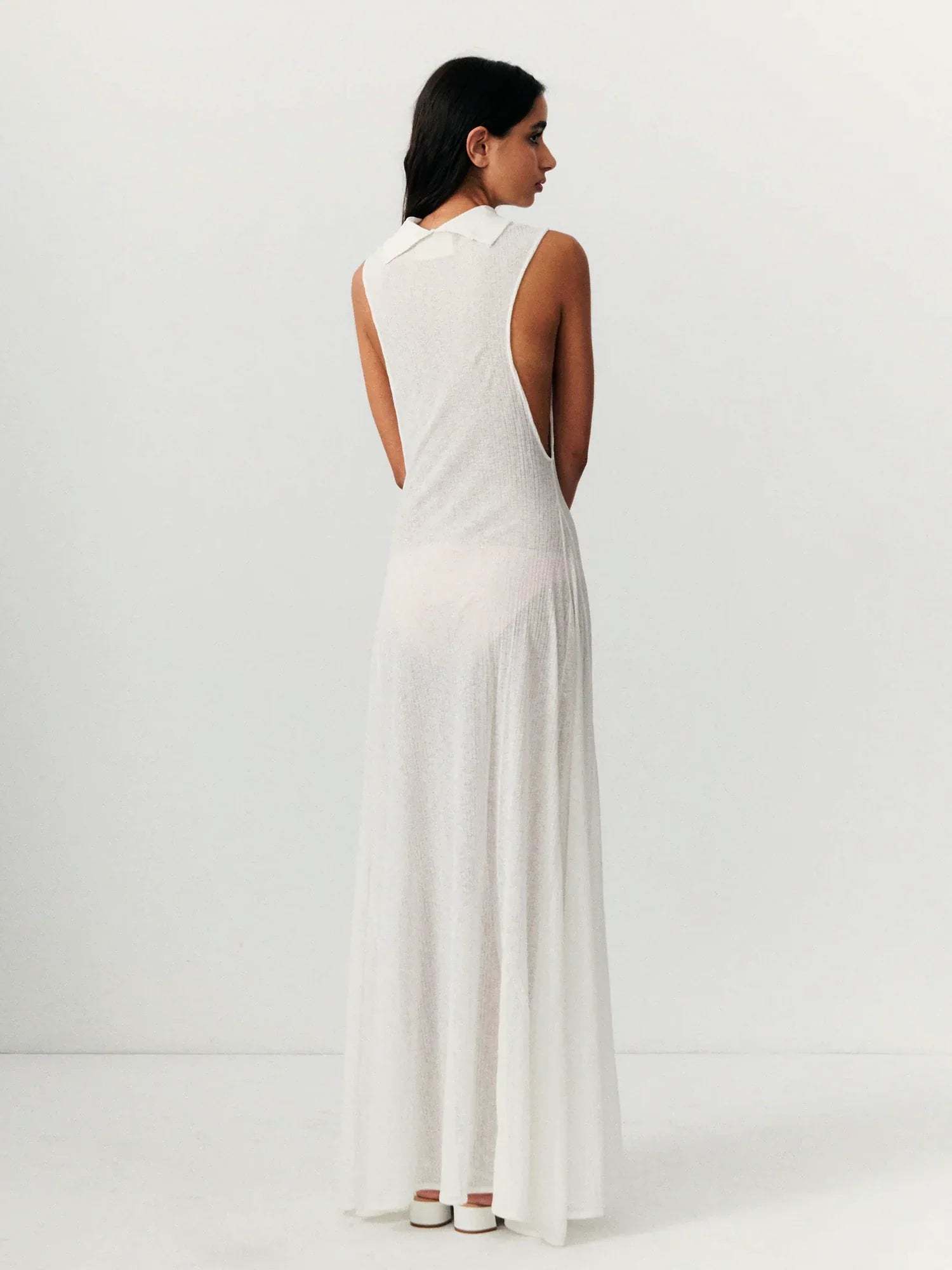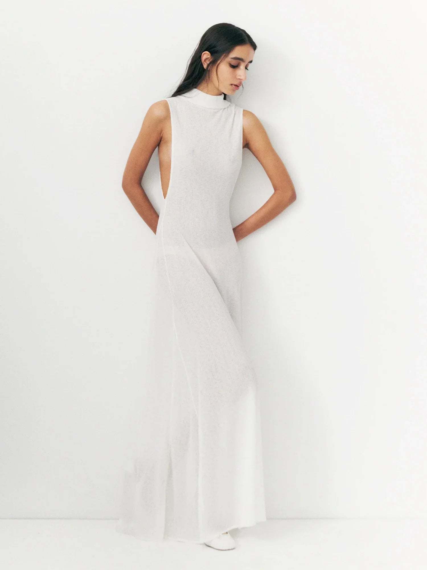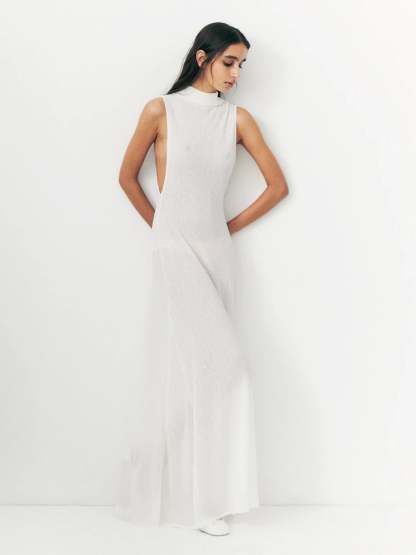 This elegant extra-long sleeveless high-neck dress combines simplicity and refined details, making it an essential piece in your wardrobe.