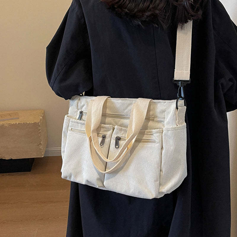 ثلاثة أقسام بسحاب في مقدمة هذه الحقيبة المصنوعة من قماش القطيفة لتلبية احتياجاتك المختلفة.